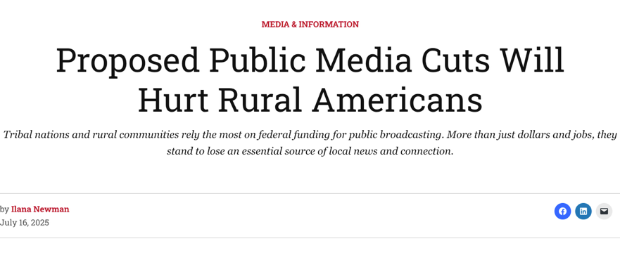 △美国非营利媒体The Daily Yonder刊文批评,削减对公共媒体的支持,将是对农村地区的损害
